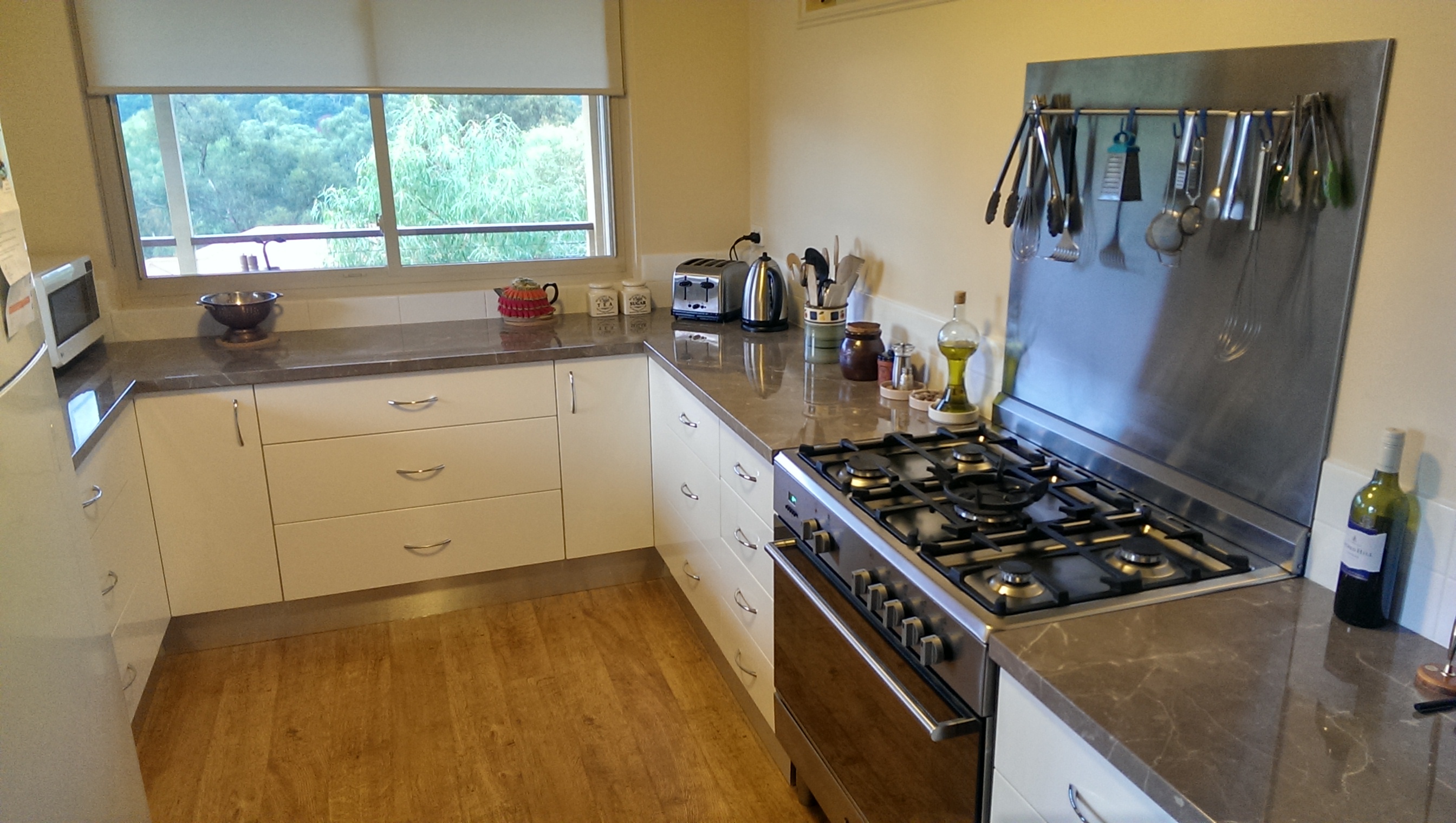 The kitchen is brand new, with ample drawer and cupboard space. It too has magnificent views over Healesville, Yarra Valley. The oven is a Baumatic 900mm with 5 burners. This dream kitchen has a separate wash-up area with dishwasher beside a large walk-in pantry.