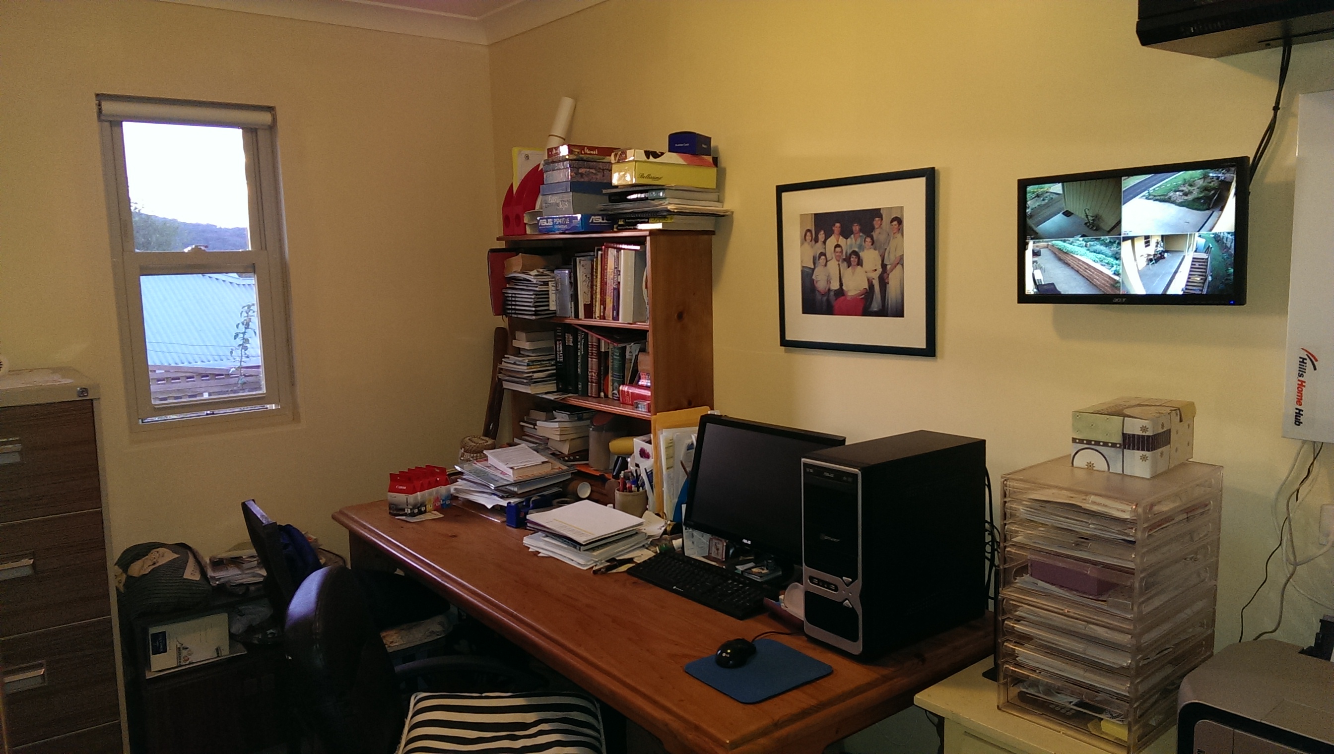 The office is a large work-space which includes the control hub for the house security system and TV/data that connects to each room.